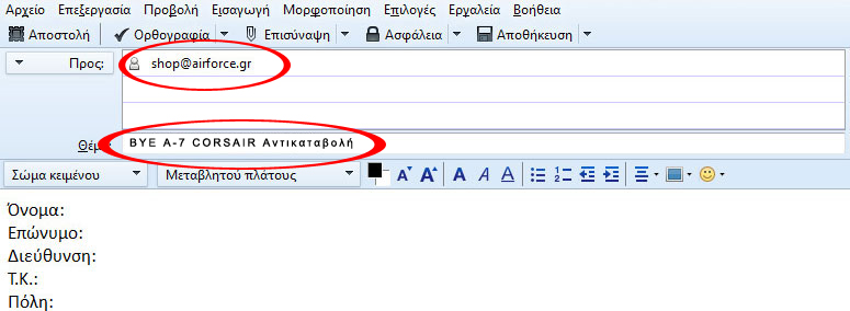 Αν δε διεθέτετε λογαριασμό Paypal μπορείτε να παραγγείλετε το σήμα με αντικαταβολή στέλνοντας τα στοιχεία σας (Ον/μο, Δ/νση, Πόλη, Τ.Κ.) με ένα απλό e-mail με τίτλο "BYE A-7 CORSAIR Αντικαταβολή" στην ηλεκτρονική διεύθυνση shop @ airforce.gr . Παράδειγμα: